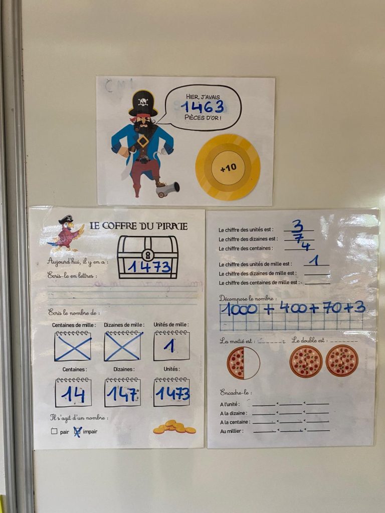 Pendant 10 minutes, les élèves sont en autonomie sur leur fiche A4, pendant que les 2 responsables de la semaine tentent de compléter l’exemplaire du tableau, et ajoutent les unités, dizaines, centaines et milliers nécessaires.