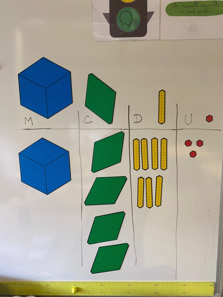 J’insiste bien à chaque fois sur « le nombre de … » et « le chiffre des… « . Je leur demande systématiquement de me donner le nombre de dizaines présentes dans la centaine, le nombre de dizaines et de centaines dans le millier… tout en le matérialisant à l’aide des bases de 10 aimantées.